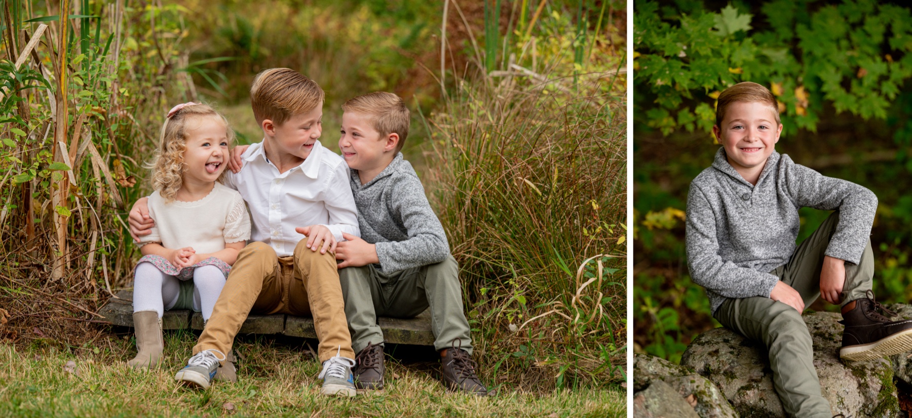 three kids sit on stone wall for Sterling MA backyard family sessions